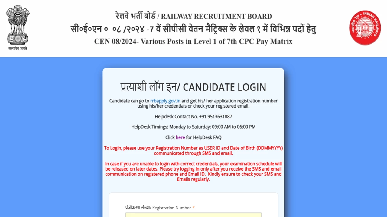 Candidates must use only the registration number and date of birth to access the RRB Group D admit cards.
