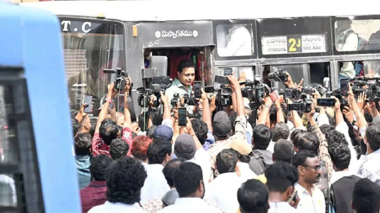 KTR and others met RTC MD Nagireddy and demanded rollback of the fare hikes and raised the issue of pending dues of Rs 1,353 crore under Mahalakshmi scheme and alleged that the state government is plotting to privatize RTC despite Rs 9,246 crore grants released.