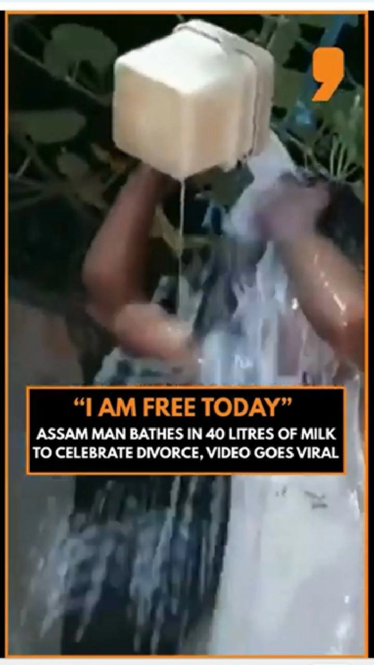Nalbari, Assam | In a bizarre and viral act, Manik Ali, a resident of Assam’s Nalbari district, celebrated his divorce by pouring buckets of milk over himself, calling it a “freedom bath.” Ali’s video went viral after he claimed his wife had eloped multiple times, leading the couple to part ways legally. The act has triggered a mix of amusement and debate on social media.