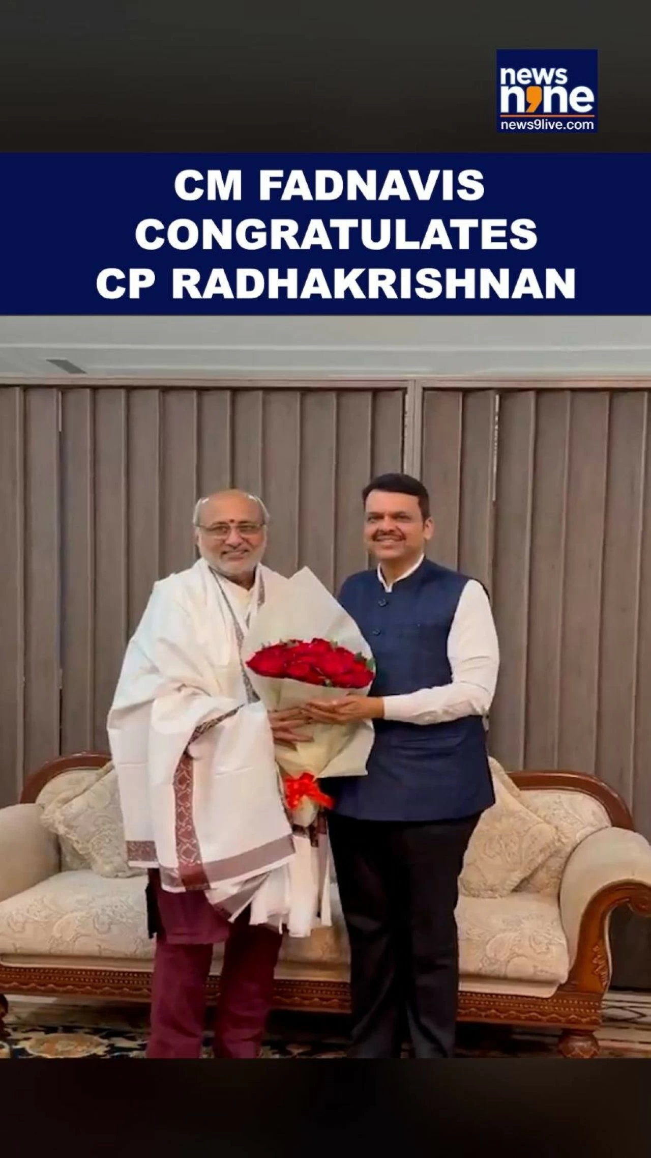 Maharashtra Chief Minister Devendra Fadnavis presents shawl to CP Radhakrishnan as congratulates him for being nominated as the National Democratic Alliance's (NDA) Vice President candidate.