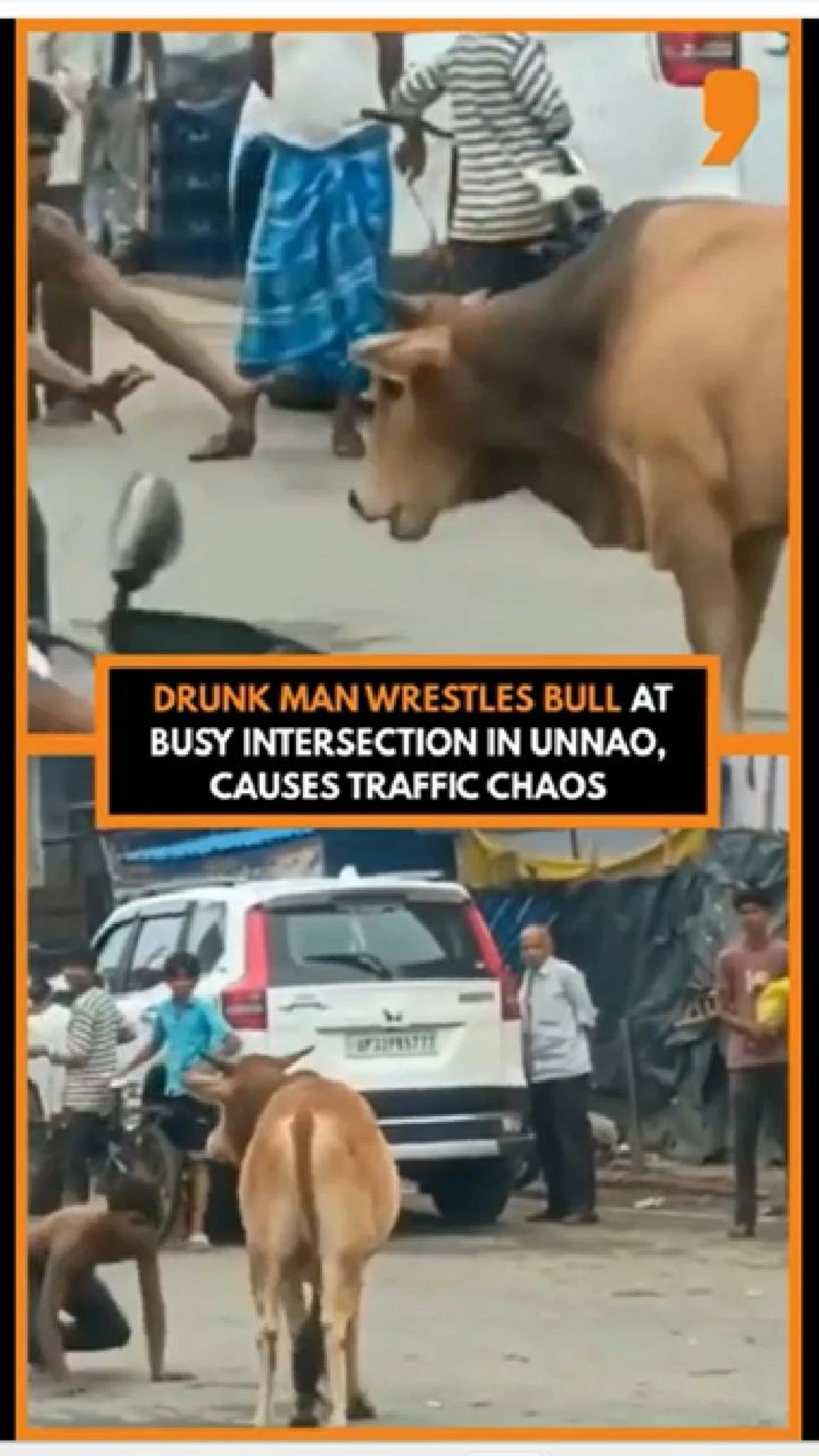 Drunk Unnao Man Wrestles Bull On Busy Road in Uttar Pradesh