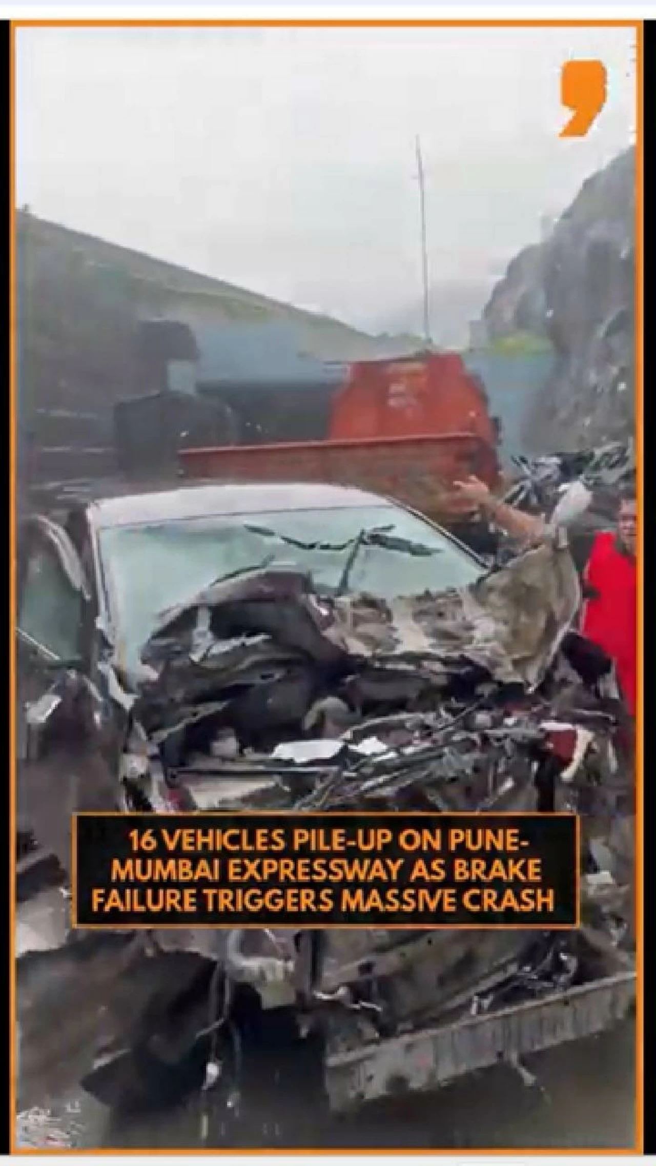 A horrifying 16-vehicle pile-up on the Pune-Mumbai Expressway around 3 PM today has left one person dead and several others injured. The tragic crash was triggered by a speeding container truck that reportedly suffered a brake failure, leading to a chain collision involving multiple vehicles.