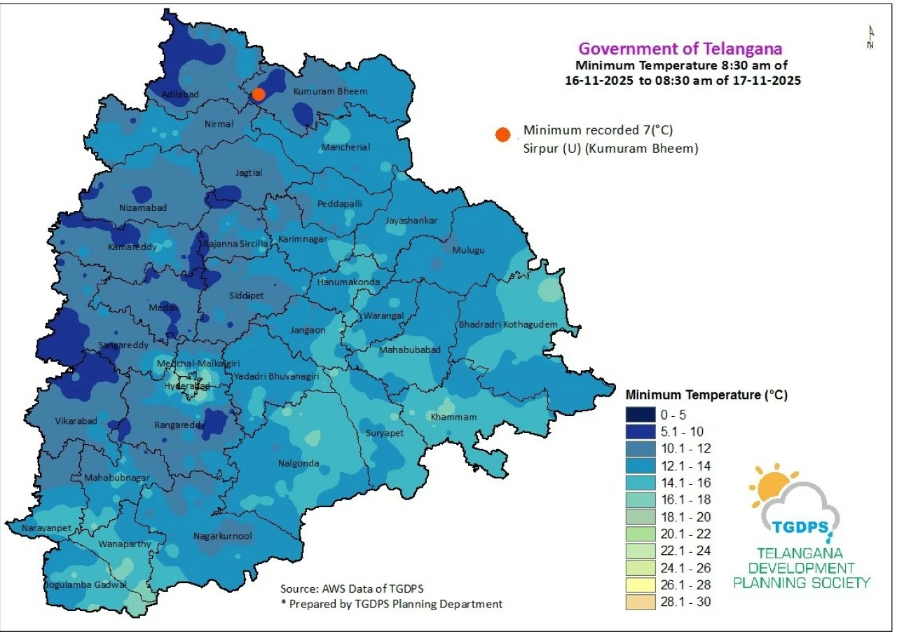 Hyderabad: Several districts in Telangana recorded temperatures in single digits including Komarambheem Asifabad with 7°C while Snagareddy has recorded 7.1°C, Adilabad recorded 7.7°C followed by Vikarabad, at 8.1°C. Kamareddy, Nizamabad, Jagtial, Medak, Nirmal recorded temperatures below 10°C.