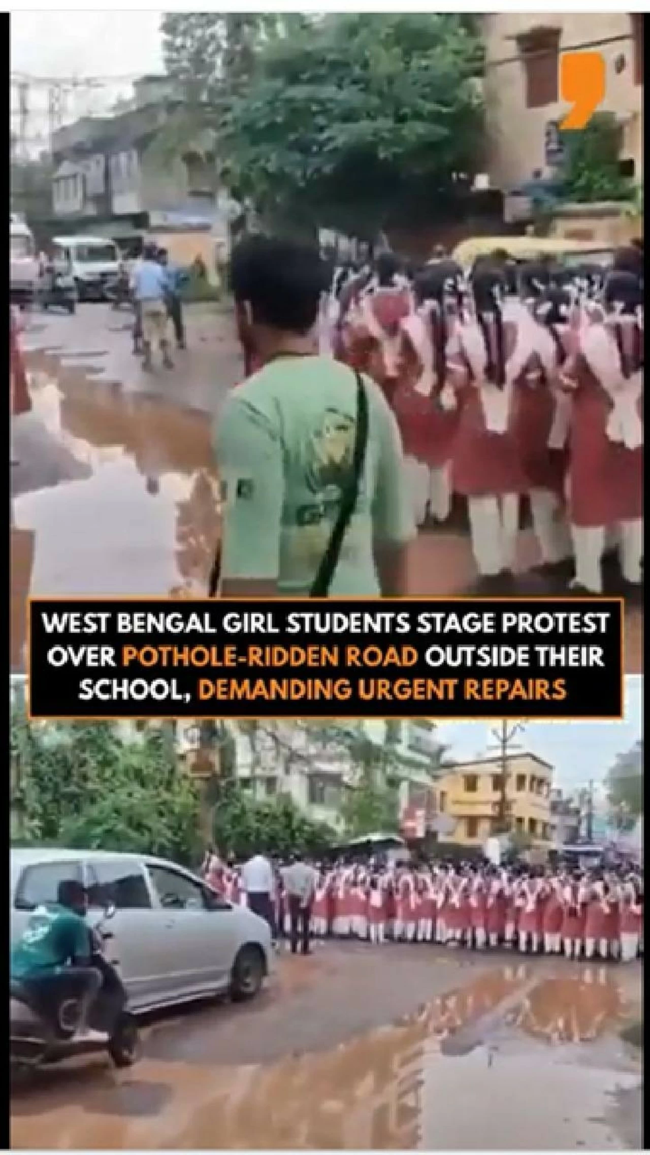 Schoolgirls from Behala Jot Shibrampur School in Maheshtala, West Bengal, took to the streets on Monday to protest the deplorable condition of the road leading to their school. The pothole-ridden stretch has become a significant safety hazard, particularly during the monsoon season, with students describing it as a "death trap."