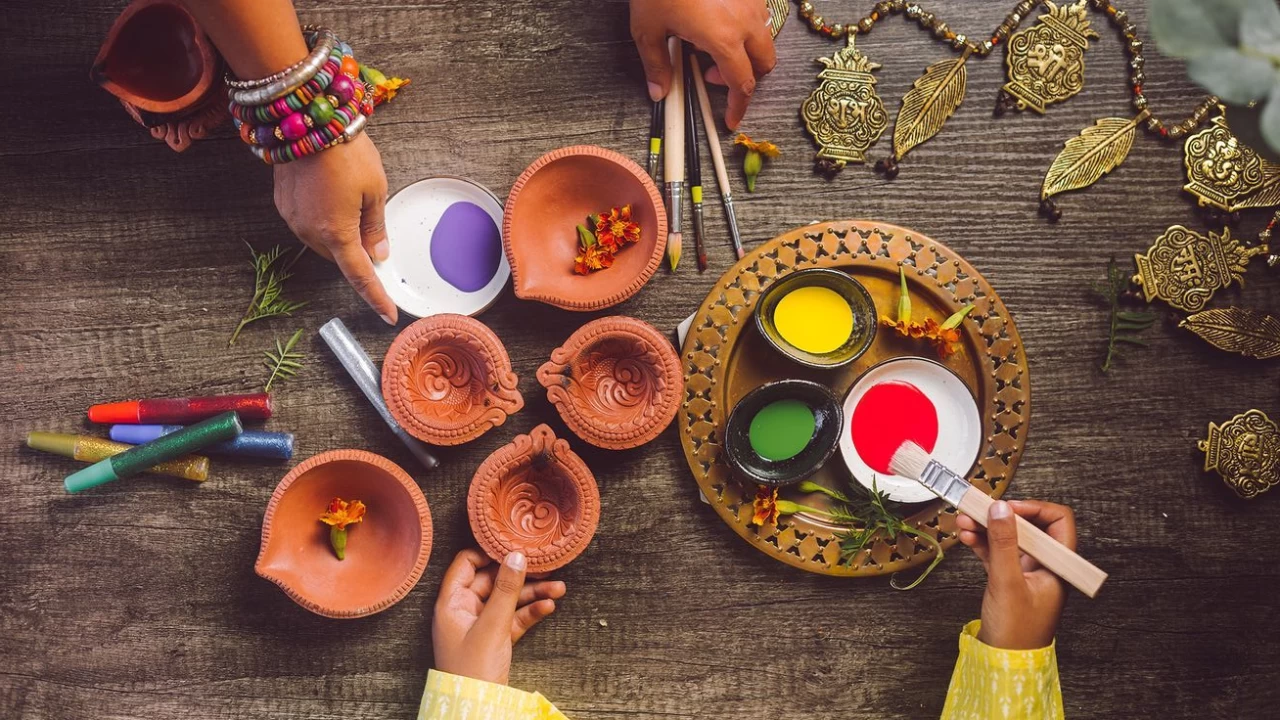 Materials needed: Plain clay diyas, acrylic paints, fine brushes, glitter, sequins, glue, markers, and varnish for finishing.